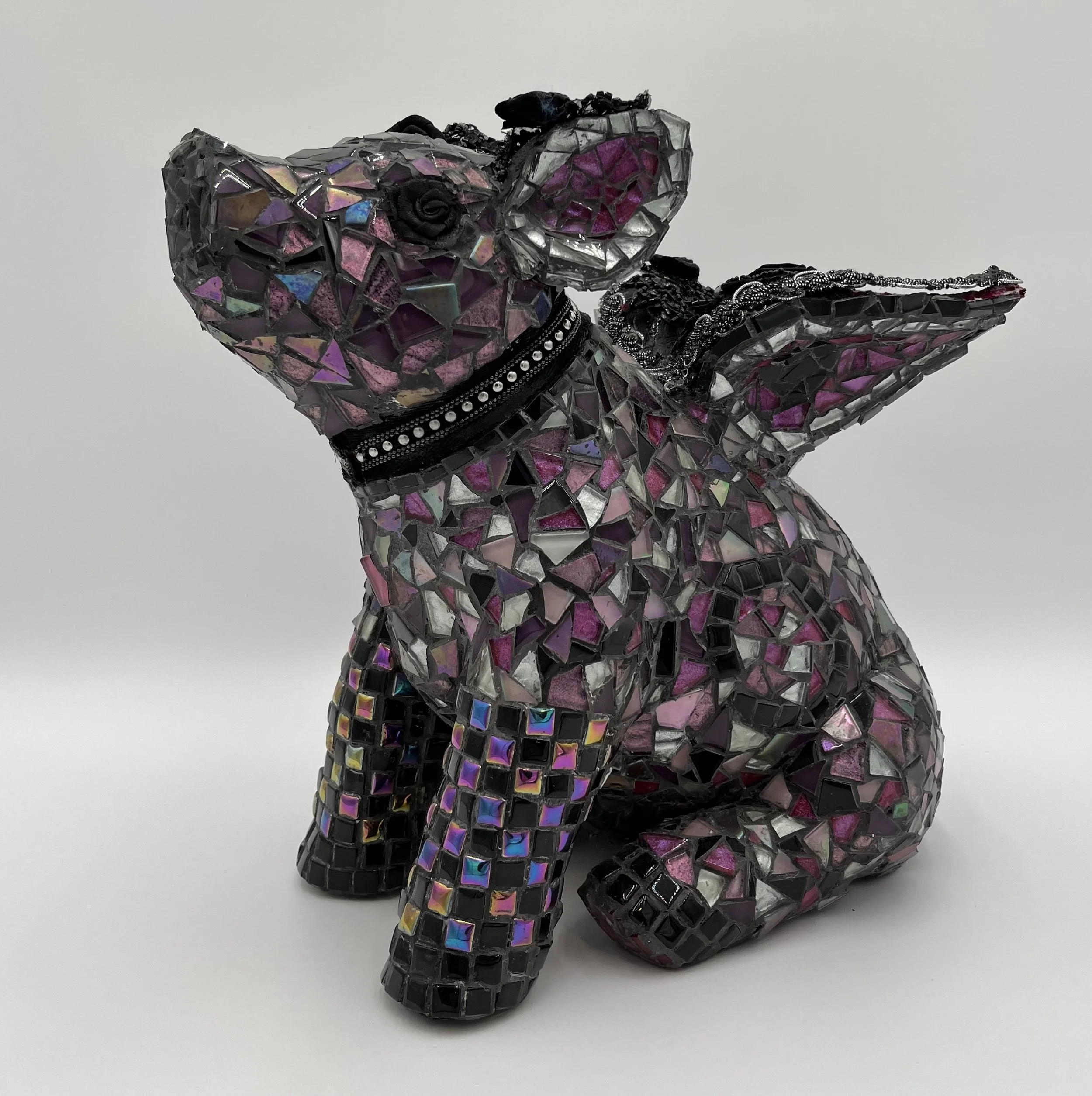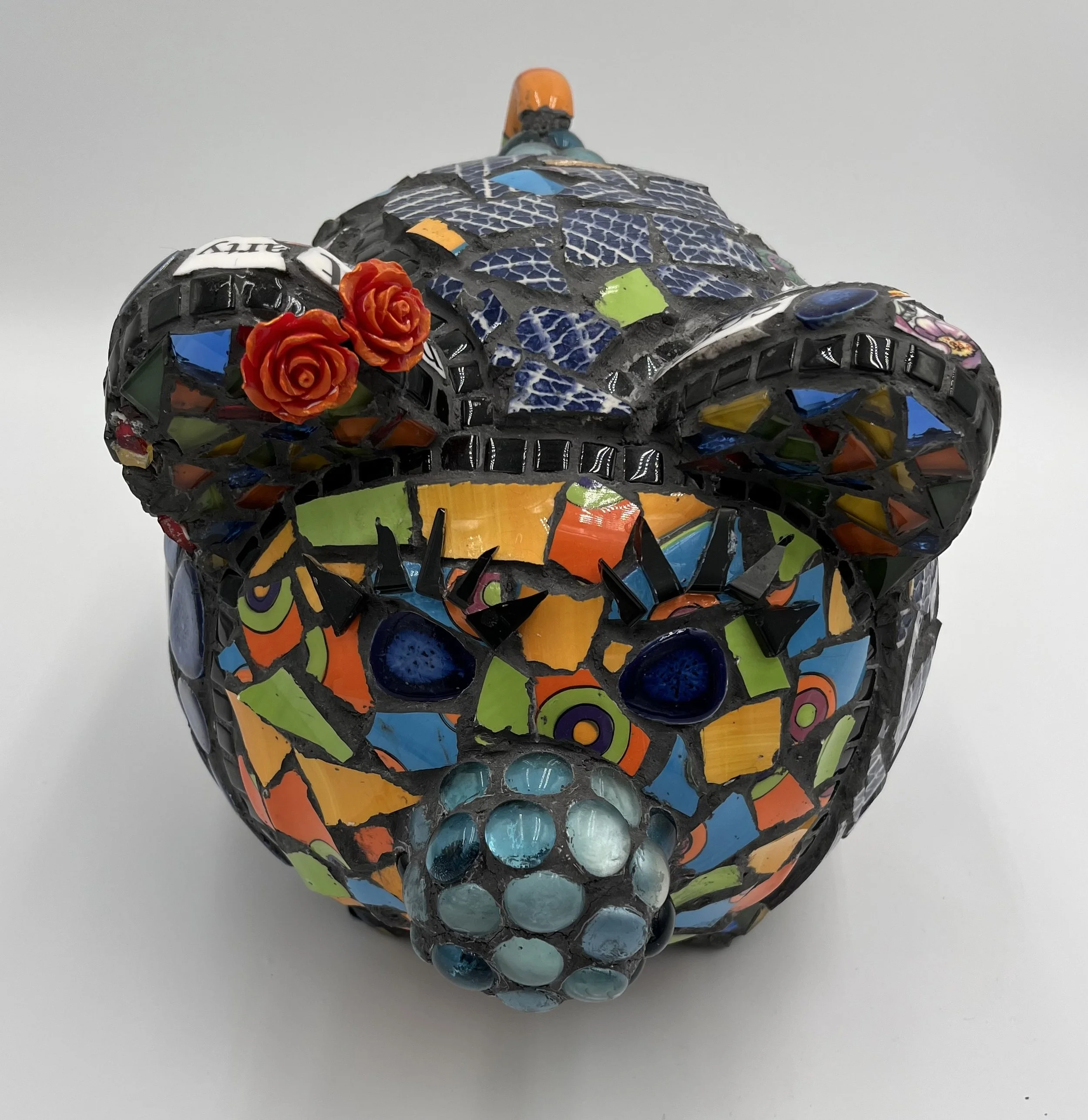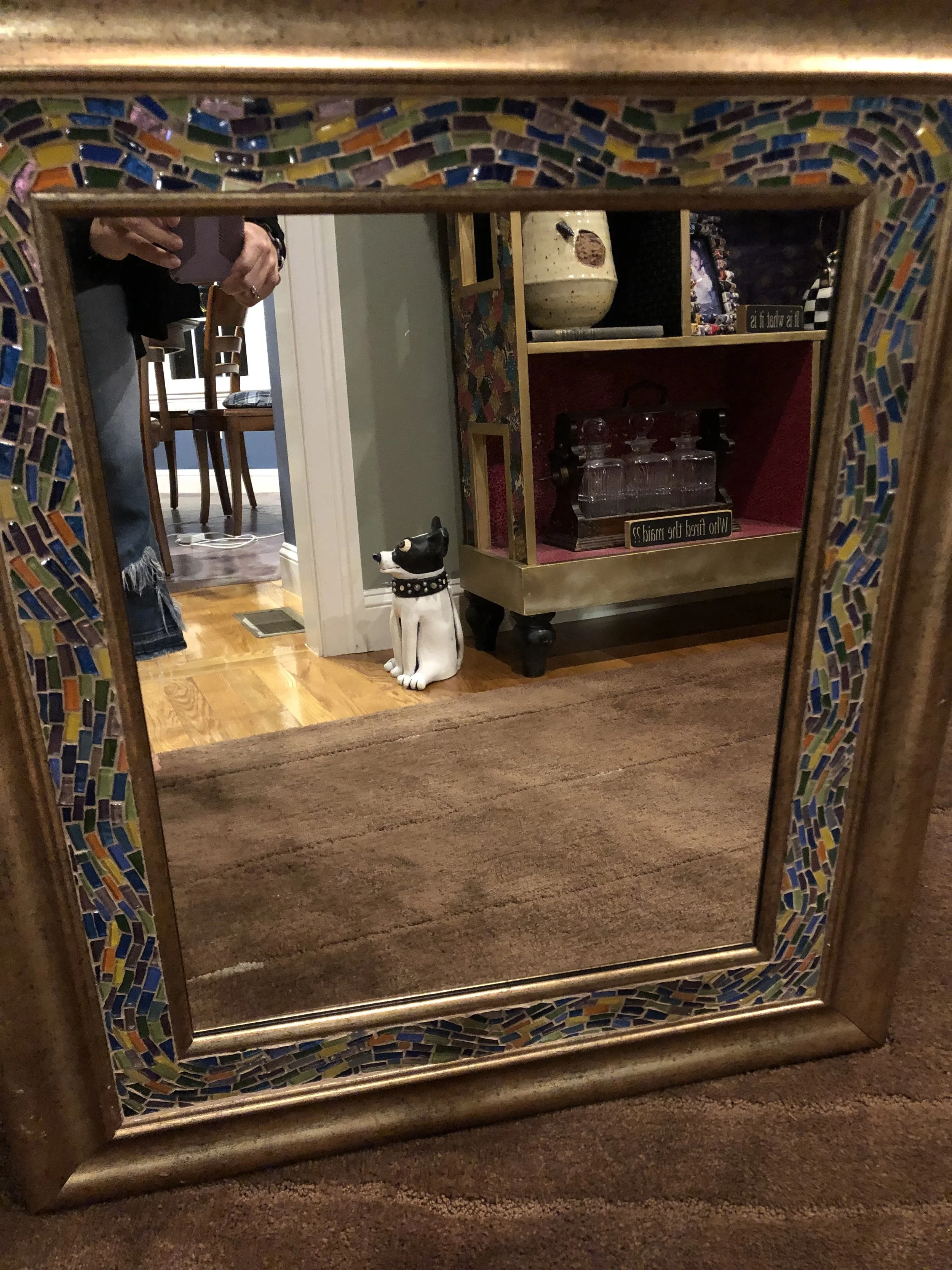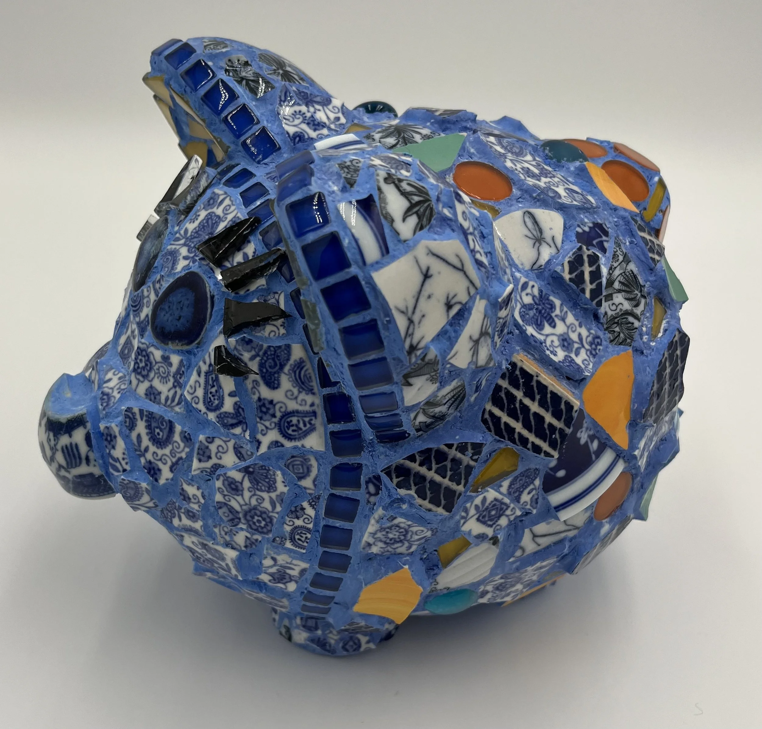 There are so many items that are elevated by mosaic art. I love to mosaic flying pig figures, lamps, frames, mirrors and more! One of my favorite pieces is a fireplace I transformed in my house.