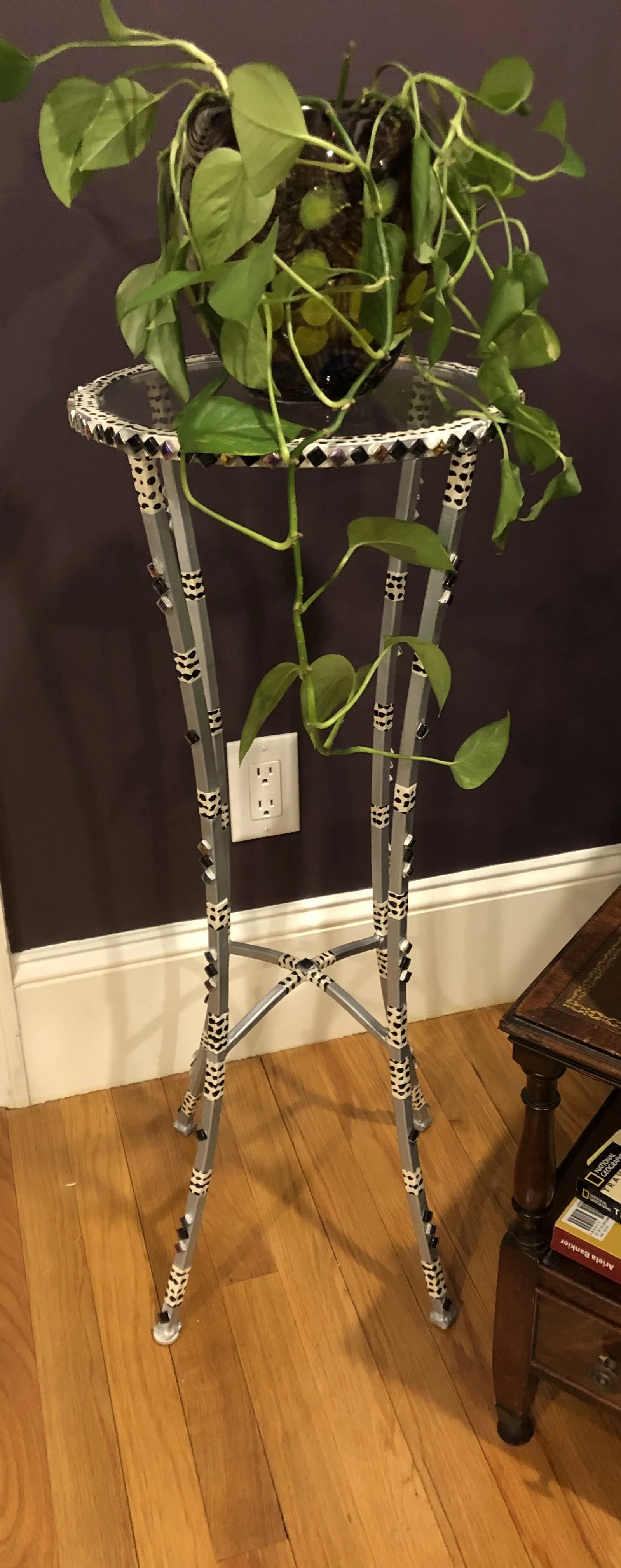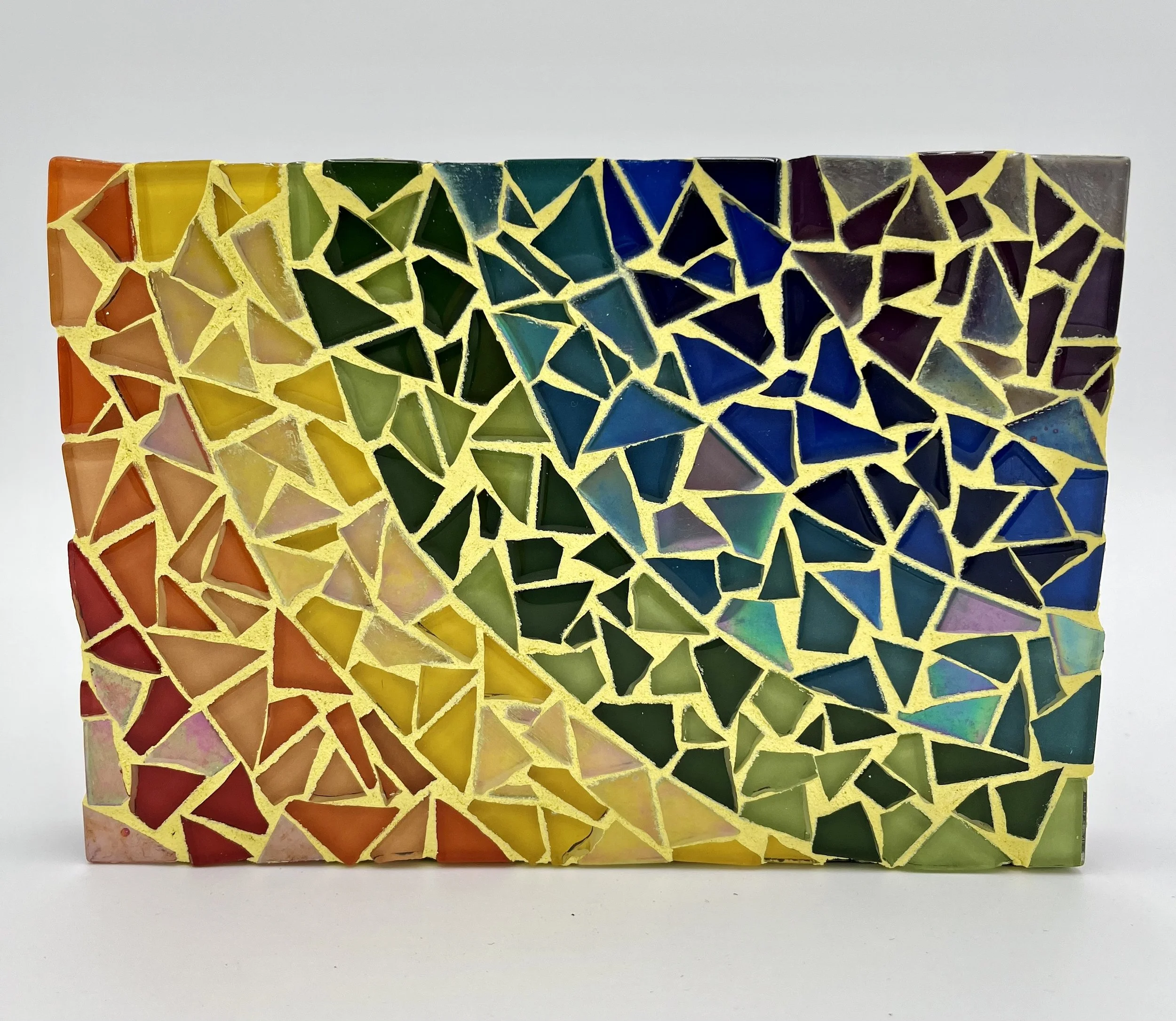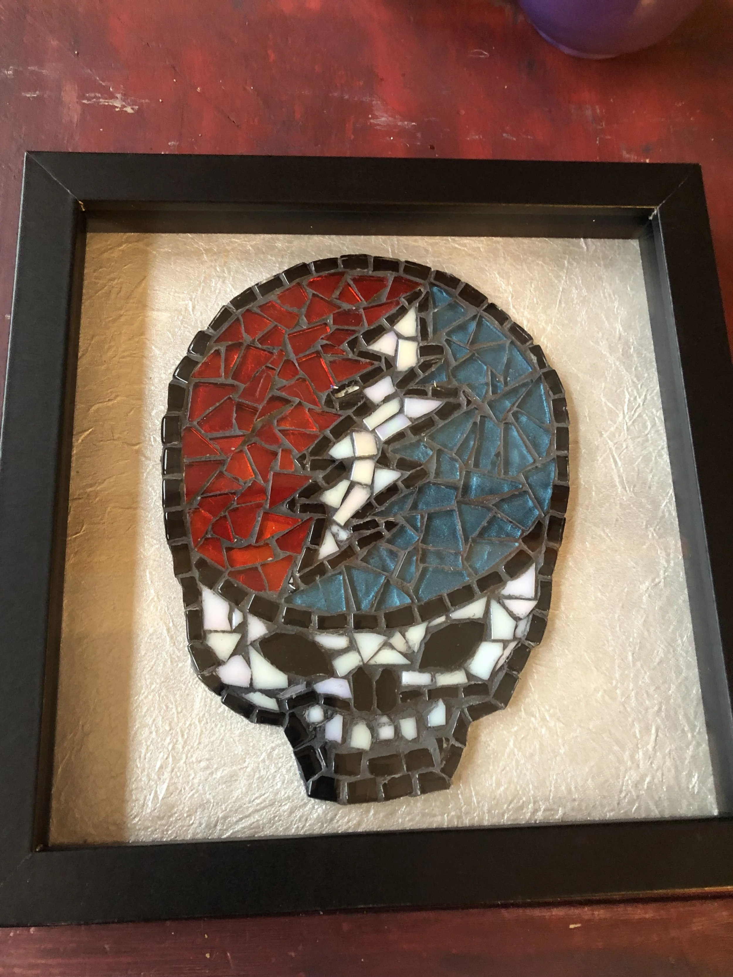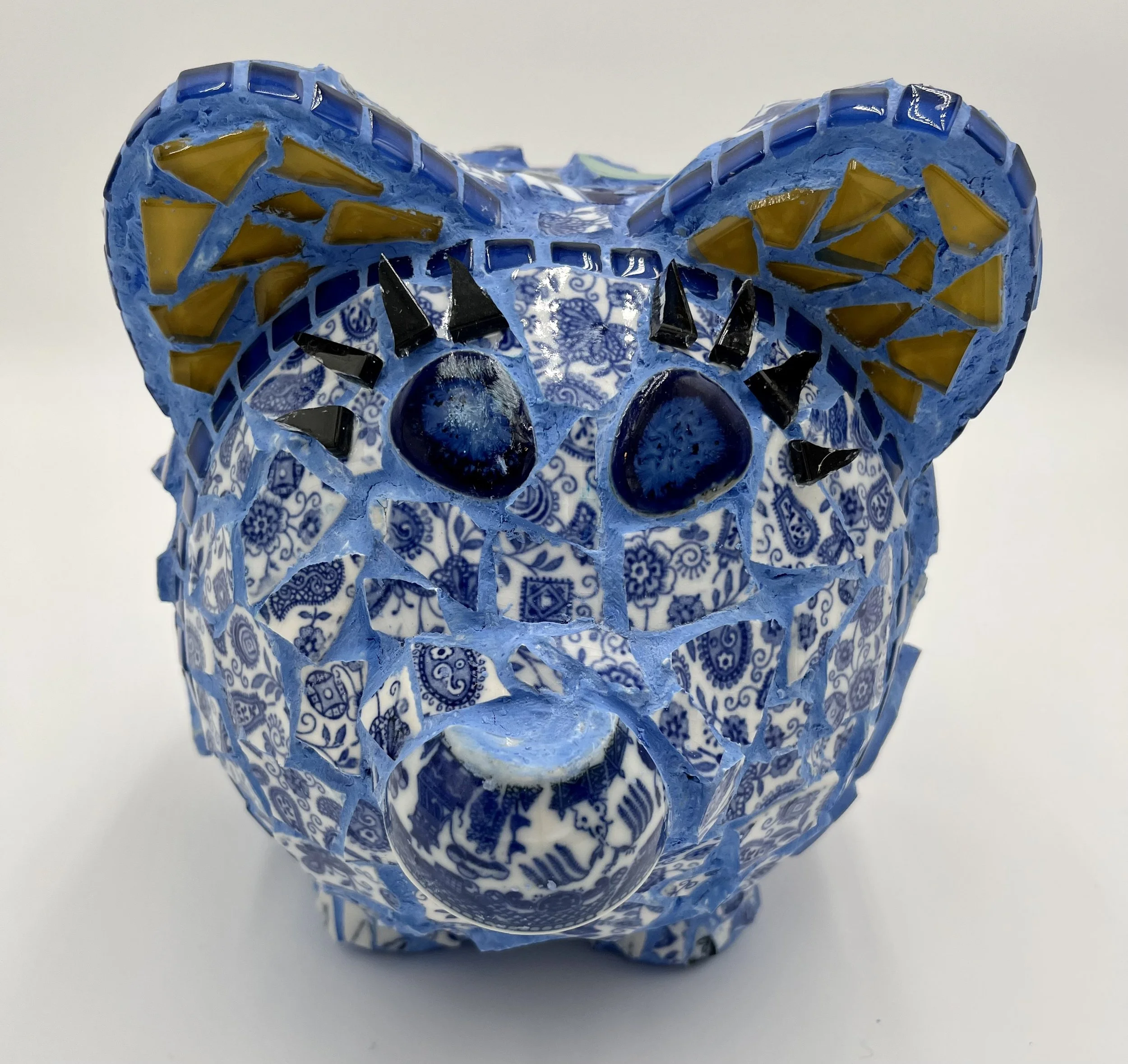 There are so many items that are elevated by mosaic art. I love to mosaic flying pig figures, lamps, frames, mirrors and more! One of my favorite pieces is a fireplace I transformed in my house.